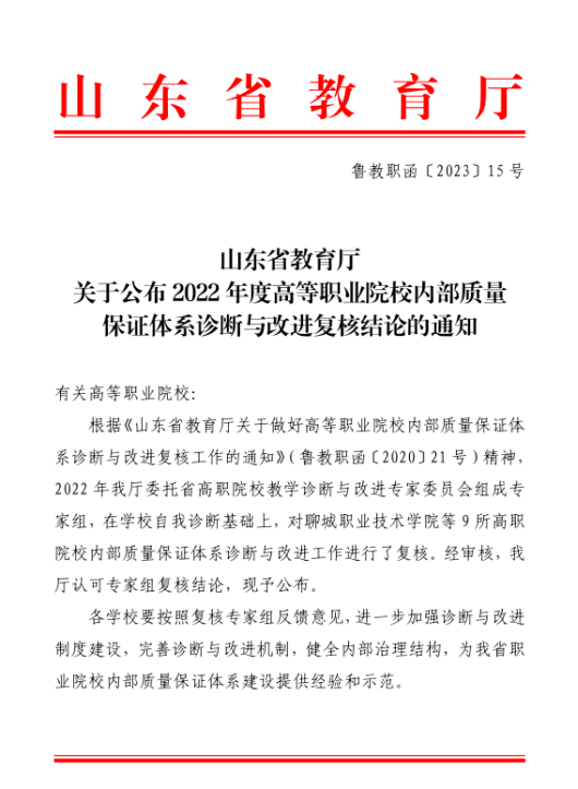 近日,山东省教育厅发布《山东省教育厅关于公布2022年度高等职业院校内部质量保证体系诊断与改进复核结论的通知》,对2022年全省9所职业院校诊改复核结果予以公布,学校顺利通过省高职院校诊断与改进专家委员会专家组复核,复核结论为“有效”。