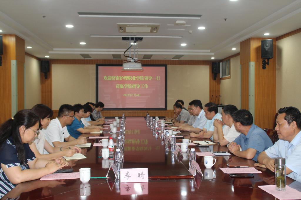 7月6日下午,济南护理职业学院党委书记周敬,党委副书记、院长曹爱民一行11人来校考察交流。学校党委书记孔祥敏,党委副书记、院长徐运国,党委副书记毕玉海出席座谈会,党委组织部(党委统战部)、党委教师工作部(人事处)、教务处、总务处及医学技术与护理系相关负责人参加座谈。徐运国主持会议。