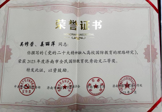 近日,2023年度济南市全民国防教育优秀论文、征文和征文活动优秀组织单位获奖名单公布,学校思政部吴修荣、姜丽萍撰写的《党的二十大精神融入高校国防教育的理路研究》获论文类二等奖。