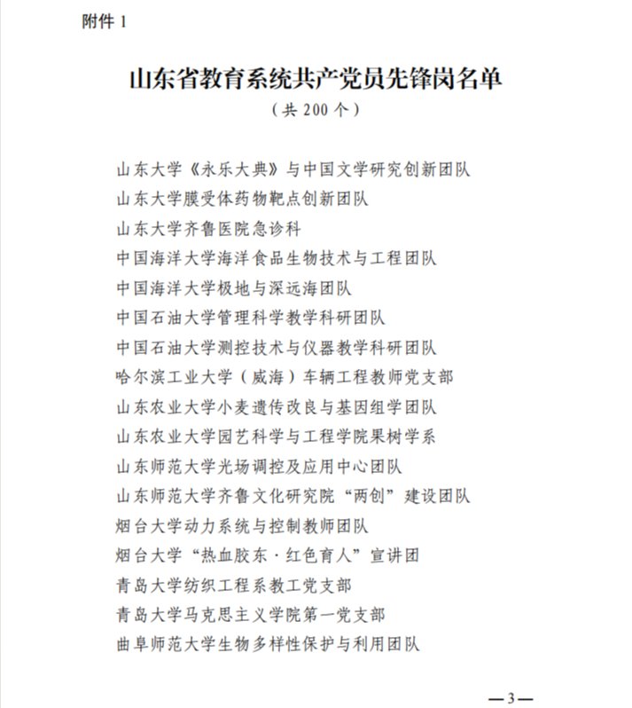 根据《关于开展全省教育系统党务工作先锋共产党员先锋岗遴选工作的通知》(鲁教工委函〔2023〕33号)要求,经学校推荐、考察、上级评审等环节,全省共评选 200 个团队为“山东省教育系统共产党员先锋岗”,199 名同志为“山东省教育系统党务工作先锋”。