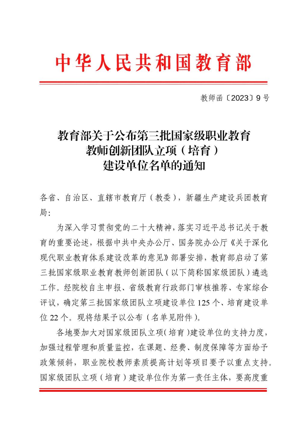 本次评选经学校申报、省级教育行政部门审核推荐、教育部专家评议立项等环节,确定第三批国家级职业教育教师创新团队立项建设单位125个、培育建设单位22个。其中“钢铁智能冶金技术专业”教学团队是山东省同类专业团队中唯一入选的,充分显示了学校深厚的团队建设基础。