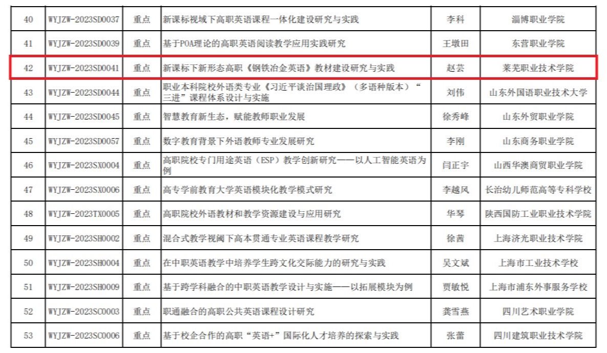 近日,教育部职业院校外语类专业教学指导委员会下发《关于公布2023年度职业教育新标准下外语教学改革与研究课题立项名单的通知》,学校立项重点课题、一般课题各1项。本次立项重点课题全国高职院校共62项,一般课题全国高职院校共116项。