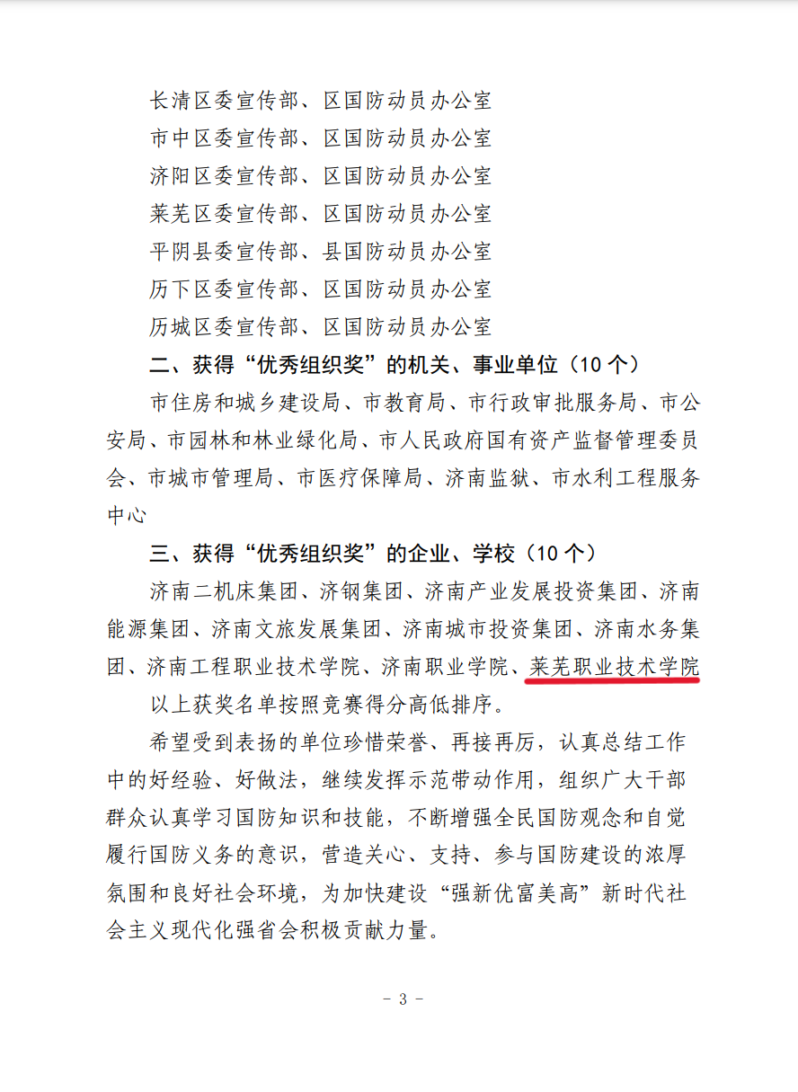 近日,市委宣传部和市国防动员办公室发布 “爱我国防 长城-2023”济南市国防教育知识竞赛结果,学校荣获“优秀组织奖”。