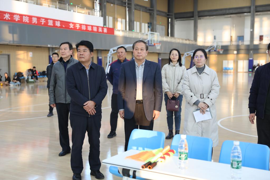 12月5号,学校首届女子排球精英赛在文体中心二楼球类馆举行。市体育局副局长宋豫,学校党委副书记、院长徐运国,党委委员、党委宣传部部长孙燕出席开赛式。