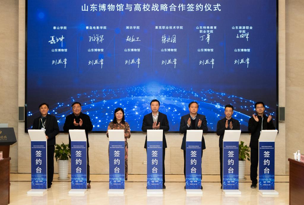 12月16日,“博物馆与高校融合发展座谈会暨山东博物馆与高校战略合作签约仪式”在山东博物馆举办,山东省文化和旅游厅二级巡视员王涛,山东省教育厅高等教育处副处长王京龙,山东大学历史文化学院院长、长江学者特聘教授方辉,山东省文化和旅游厅博物馆与社会文物处副处长陈宇,山东博物馆党委书记、馆长刘延常,包括学校在内的山东省17所高校的嘉宾参加会议。党委副书记、院长徐运国代表学校出席签约仪式并作主旨发言。