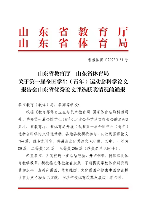 本次评选是省教育厅、省体育局根据《教育部体育卫生与艺术教育司 国家体育总局科教司关于举办第一届全国学生(青年)运动会科学论文报告会的通知》要求组织实施的论文评选活动。本次评选共遴选出来自全省各地各校的优秀论文 437 篇,其中一等奖80 篇,二等奖 151 篇,三等奖 206 篇。