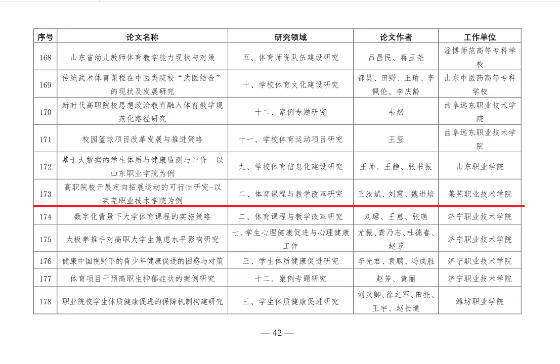 近日,学校收到省教育厅和省体育局联合下发的《关于第一届全国学生(青年)运动会科学论文报告会山东省优秀论文评选获奖情况的通报》,公共教学部报送的体育课程与教学改革研究类别论文《高职院校开展定向拓展运动的可行性研究-以人妻Av无码系列一区二区三区为例》荣获全省学校三等奖。