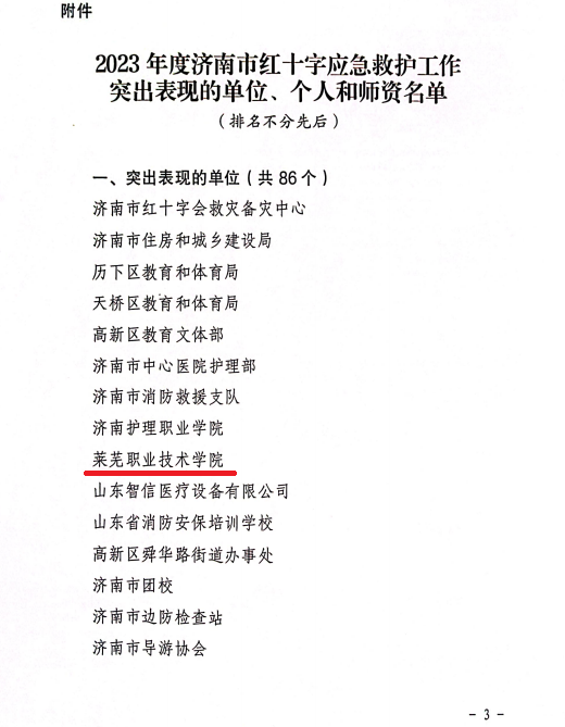 近日,山东省红十字会、济南市红十字会发布文件,表扬2023年在应急救护工作做出突出贡献的单位与个人。学校被山东省红十字会授予“2023年度山东省红十字会应急救护工作先进单位”,被济南市红十字会授予“2023年度济南市红十字会应急救护工作突出表现的单位”,其中1人被授予“2023年度山东省红十字会应急救护工作先进个人”,1人被授予“2023年济南市红十字会应急救护工作突出表现个人”,8人被评为“突出表现师资”,4人被济南市红十字会授予“红十字最美救护员”荣誉称号。