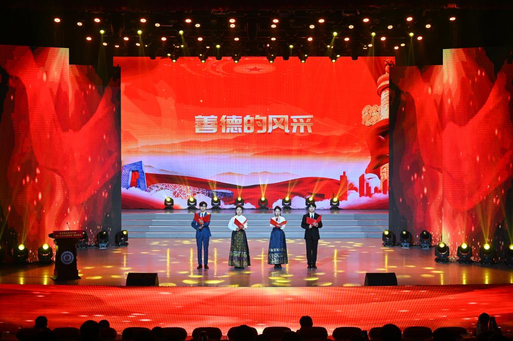 颁奖过程中,师生穿插表演了《感恩的心》《好人就在身边》《善德的风采》《让世界充满爱》等节目,号召全校广大青年学子以受表扬的道德模范为榜样,树立正确的道德认知,注重自觉的道德养成,从现在做起、从小事做起、从身边事做起,积极投身到道德实践活动之中,把最精彩、最无悔的答卷写进自己的“诗与远方”。