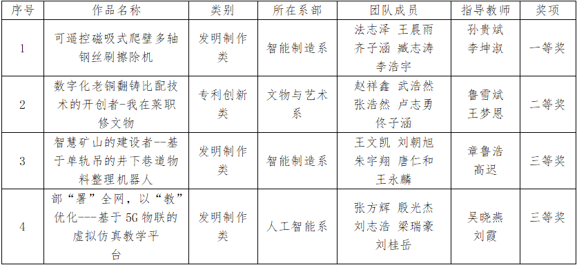 经过前期发动和层层选拔,学校报送的52项作品中有7项进入复赛。通过参与本次大赛,调动了学生发明创造的积极性和主动性,增强了学生的科技创新意识,为培养创新人才奠定了坚实基础。下一步,学校将以全国性大学生科技创新竞赛为抓手,培养学生创新实践能力,提升学生发明创造兴趣、科技创新思维和知识产权保护意识,促进学生创新创业成果转化,营造良好的科技创新氛围,持续探索规范化、体系化的以赛促创、以赛育人的培养模式。