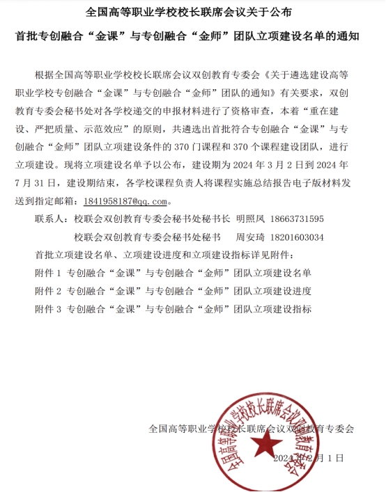 近日,中国高职高专教育网发布《全国高等职业学校校长联席会议关于公布首批专创融合“金课”与专创融合“金师”团队立项建设名单的通知》,学校推荐的《古籍修复》《微生物发酵技术》等五门课程及教学团队获得首批专创融合“金课”与专创融合“金师”团队立项。