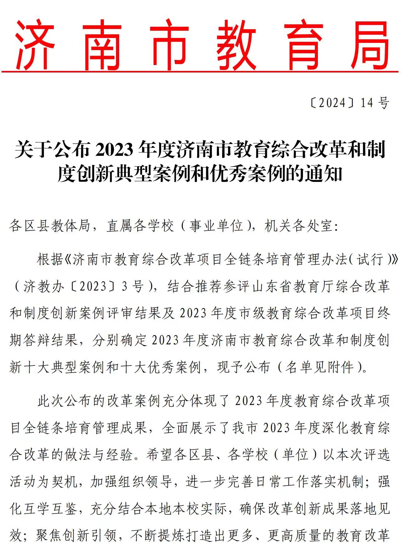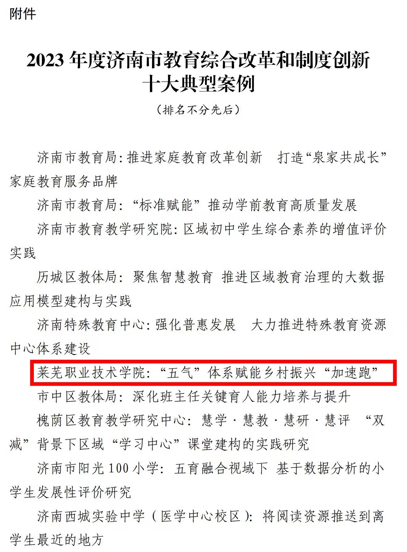 近日,市教育局下发《关于公布2023年度济南市教育综合改革和制度创新典型案例和优秀案例的通知》,学校报送的案例《“五气”体系赋能乡村振兴“加速跑”》成功入选2023年度济南市教育综合改革和制度创新十大典型案例,是唯一入选的市属高校。