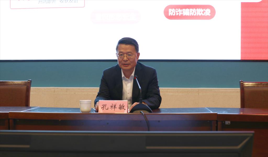 在主会场图信中心报告厅,孔祥敏从校园安全事故真实案例入手,并结合自身体会,对安全事故进行了剖析。他表示,校园安全问题,关乎亿万家庭的幸福安宁,关乎社会大局的和谐稳定。大学是梦想实现的地方,同学们不仅可以学到专业知识和技能,而且可以开阔眼界、收获友谊,为自己创造美好未来奠定基础,但交通安全、消防安全、校舍安全、实验室安全、食品安全、财物安全、校园周边安全、网络安全、心理健康、意识形态安全以及防诈骗防欺凌等方面的事故时有发生,必须要高度关注、时刻警惕。