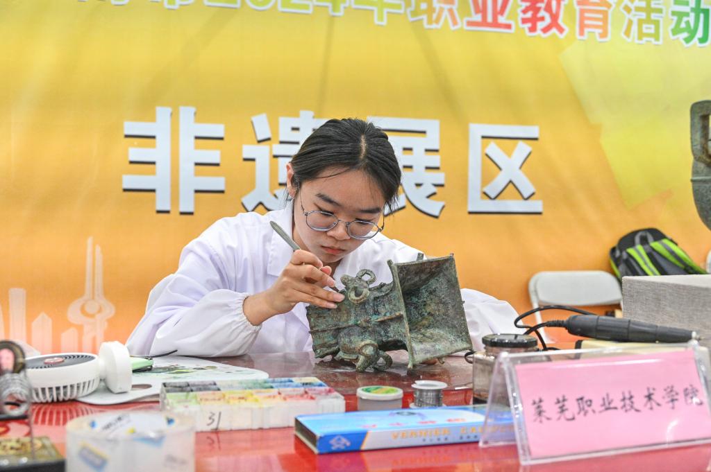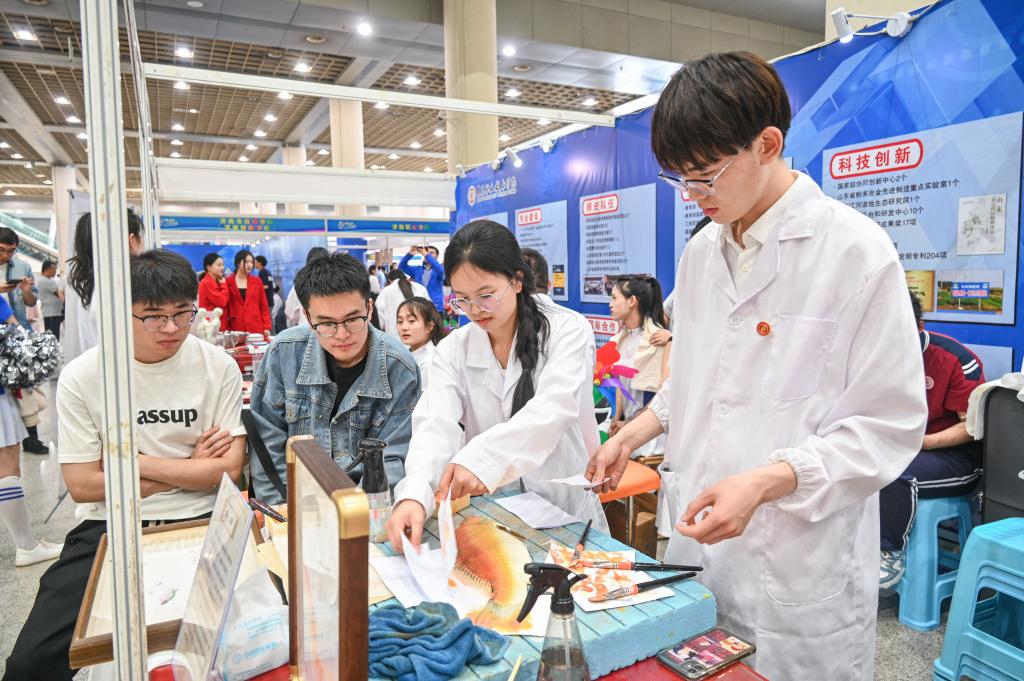 千年文化共传承。文物与艺术系现场展示的拓印技艺、木雕技艺、鱼拓技艺、古籍修复、青铜器修复、陶瓷修复、釉上新彩、内画制作等非遗项目,吸引现场观众驻足观看,并亲自体验制作。