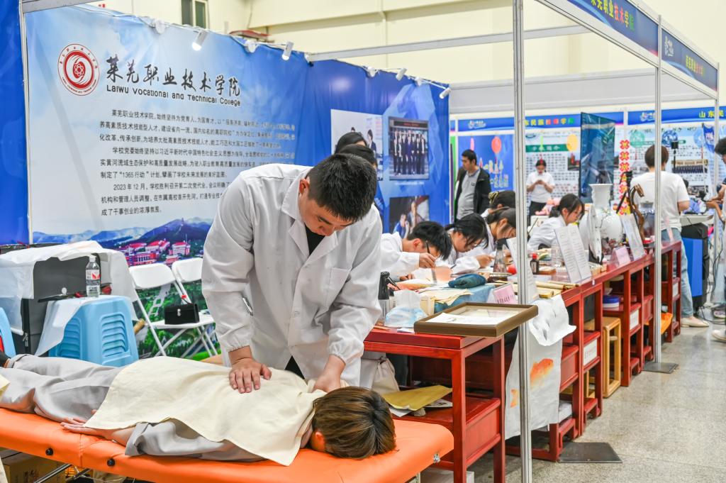 推拿技术与耳穴疗法是两项传统康复医学中应用较为广泛的康复治疗技术。医学技术与护理系现场展示了推拿与耳穴疗法,吸引了现场观众排队体验。
