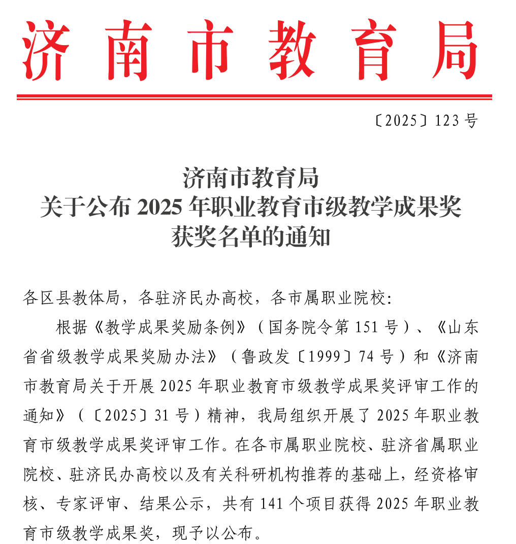 近日,济南市教育局公布2025年职业教育市级教学成果奖评审结果。学校共有9个项目获得2025年职业教育市级教学成果奖,其中宋健团队申报的《“双元协同 双站共培”智能制造专业群高水平结构化教师团队建设模式创新实践》获特等奖,孟宪超、孙立辉、王家利3个团队申报的成果获一等奖。