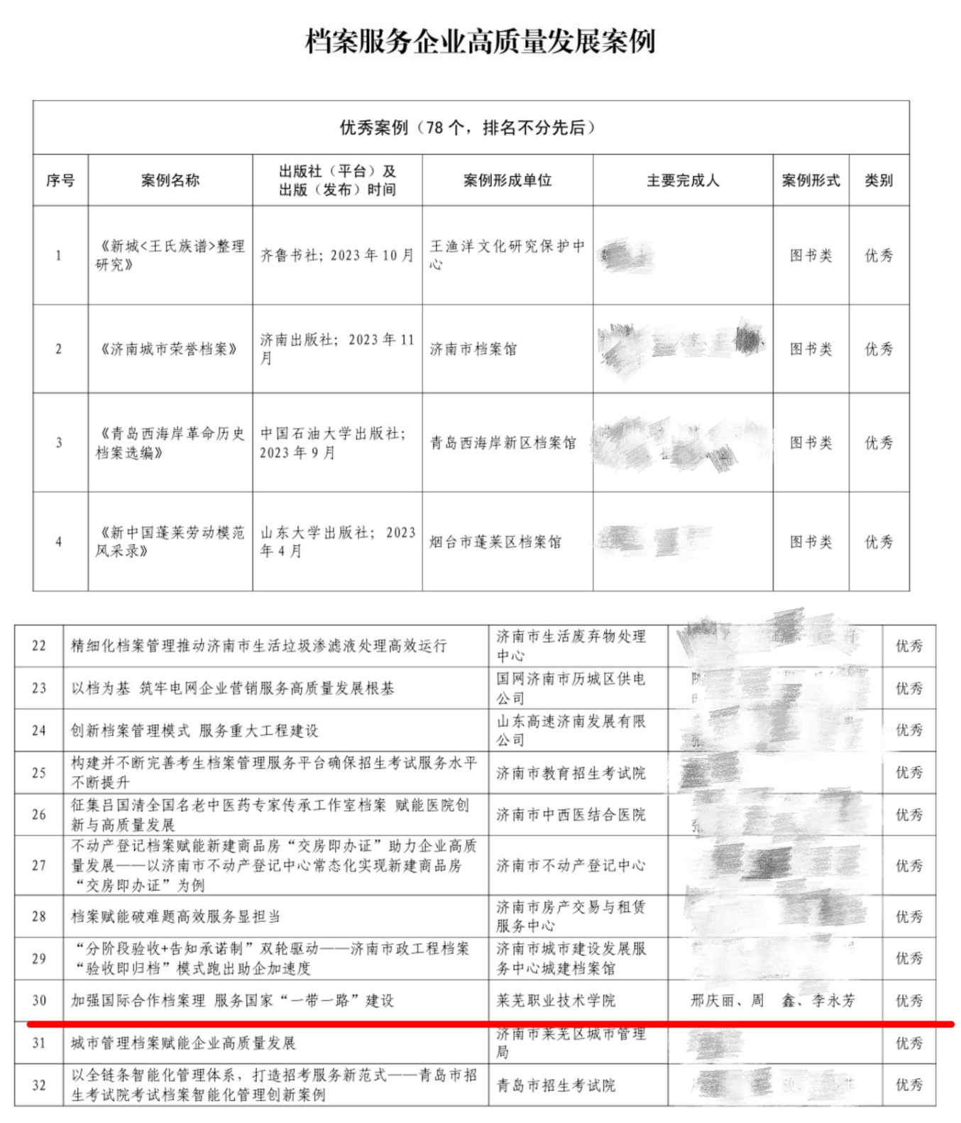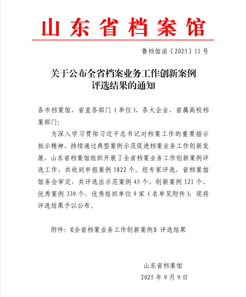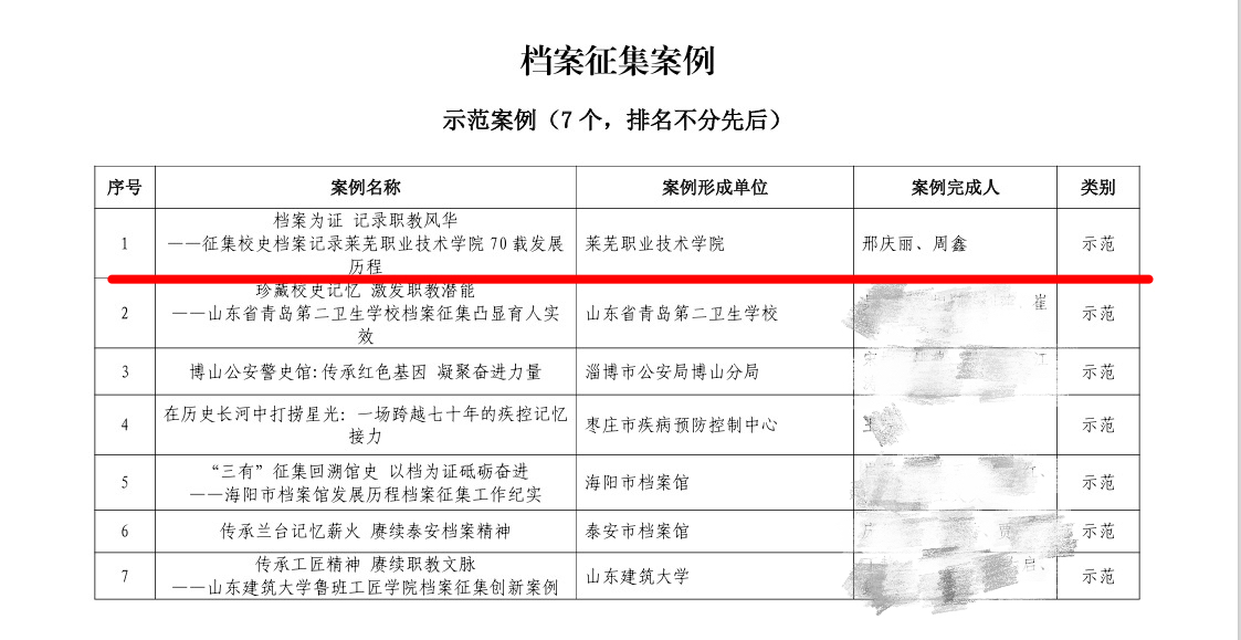 近日,山东省档案馆公布了全省档案业务工作创新案例评选结果,我校2个案例成功入选。其中,《加强国际合作档案管理 服务国家“一带一路”建设》被评为优秀案例,《档案为证 记录职教风华》被评为示范案例。