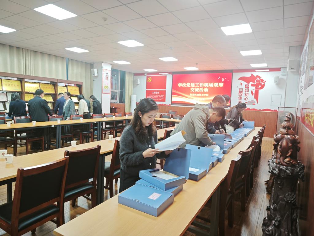 汇报交流结束,大家实地查看了智慧商贸与旅游系的党建活动场地和党建工作档案。