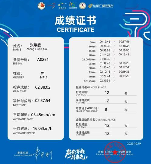 10月19日,2025年济南(泉城)“泉在济南·一马当先”马拉松全国邀请赛在济南举行,学校田径队选手张焕鑫跑出2小时37分54秒的优异成绩,一举夺得本次全马赛项济南市籍参赛选手第1名、34岁以下组别第8名、总成绩第12名的佳绩。