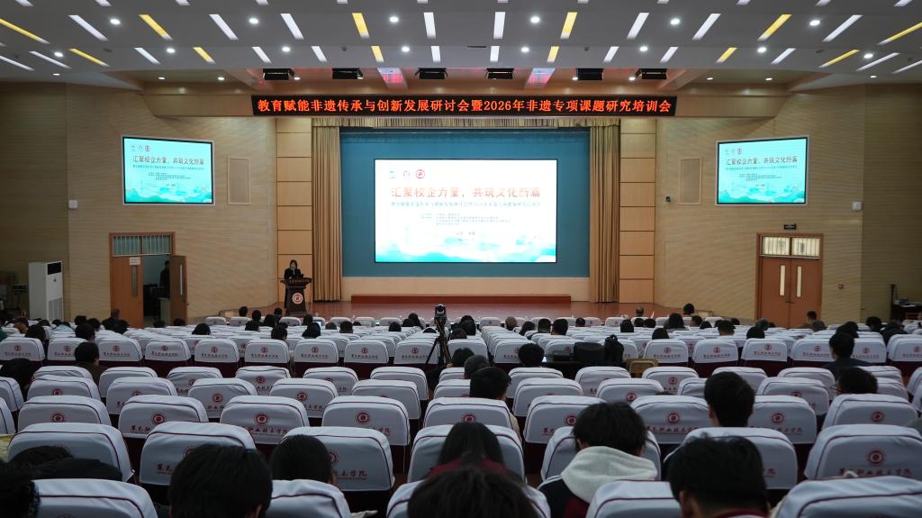 11月24日上午,由中国成人教育协会指导和主办,中国成人教育协会非遗传承教育培训专业委员会、山东省省会经济圈产教联合体文化建设和国际交流委员会、学校共同承办的教育赋能非遗传承与创新发展研讨会暨2026年非遗专项课题研究培训会在学校召开。中国成人教育协会副会长赵跃进;文化和旅游部艺术发展中心专家尚虎辰;济南市教育局党组成员、副局长王志国;山东省人大代表,山东省社会组织总会党委书记、会长,山东省省会经济圈产教联合体常务执行秘书长王安忠;中国成人教育协会非遗传承教育培训专业委员会秘书长张鹏飞;济南市莱芜区文化和旅游局党组副书记、副局长王美玲;学校党委副书记、院长杨洪涛出席活动。相关高等院校代表、非遗企业代表、学校各单位负责人和师生代表参加活动。仪式由学校党委委员、副院长任清华主持。