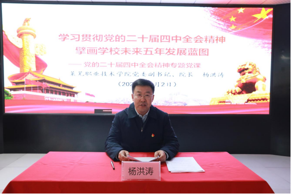 杨洪涛指出学习贯彻二十届四中全会精神,关键要落脚到推动学校事业高质量发展上来。他结合学校高质量发展规划和未来发展态势,深入分析了学校当前面临的机遇与挑战,鼓励师生要提高政治站位,强化使命担当,将学习成效转化为攻坚克难、推动工作的具体行动,共同为学校事业高质量发展贡献力量。
