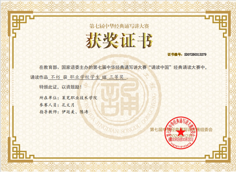 学校高度重视此次比赛,认真组织选拔与指导工作,积极鼓励学生参与。参赛学生孔文月凭借其深情演绎的诵读作品《不朽》,在全国众多优秀选手中脱颖而出,荣获“职业学校学生组”三等奖。她的朗诵情感饱满、台风沉稳、感染力强,生动诠释了作品中蕴含的民族精神与英雄情怀,充分展现了新时代职教学子扎实的语言功底、深厚的文化素养与昂扬的精神风貌。