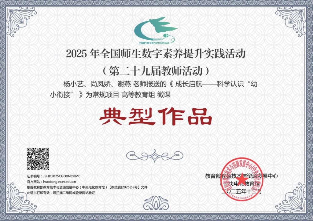 近日,教育部教育技术与资源发展中心(中央电化教育馆)发布了《关于总结2025年全国师生数字素养提升实践活动(第二十九届教师活动)参与情况的通知》(教技资[2025]59号),对年度活动成果进行了全面总结。在本届活动中,学校提交的高等教育组作品《成长启航——科学认识“幼小衔接”》经层层选拔与专家评审,荣获“典型作品”称号,展现了学校在数字化教学改革与教育技术创新应用方面的扎实成效。