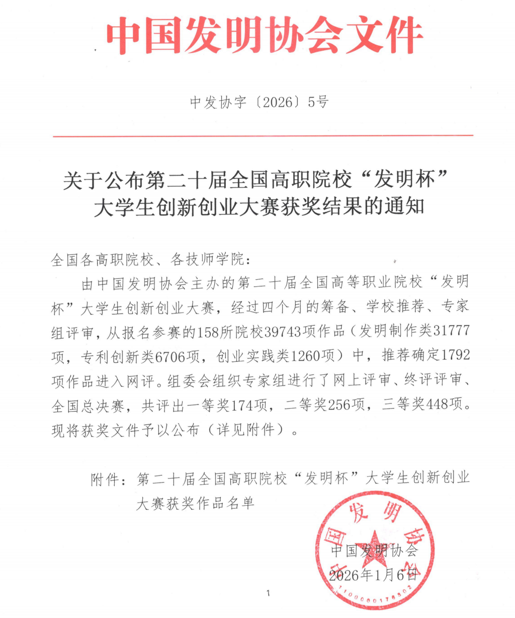 近日,中国发明协会正式揭晓第二十届全国高职院校“发明杯”大学生专利创新大赛获奖名单。学校学子凭借扎实的创新功底与亮眼的实践成果,在全国三万余支参赛队伍中脱颖而出,一举斩获19项奖项,创造学校参与该项赛事以来的历史最佳成绩。