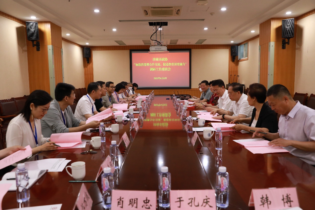 为深入开展学习贯彻习近平新时代中国特色社会主义思想主题教育,6月6日上午,济南市政协“加强济港澳合作交流,促进教育深度融合”调研组来学校实地调研。济南市政协副主席赵居安,山东省社会主义学院副院长、兼任山东省廉政研究中心副主任、山东省人民政府研究室特邀研究员、济南市委市政府法律顾问孙黎海,市政协港澳台侨和外事委员会主任高琳等调研组成员,学校党委书记孔祥敏,党委副书记、院长徐运国,副院长邹翠兰等出席座谈会,学校国际交流合作处相关负责人参加座谈会。座谈会由高琳主持。