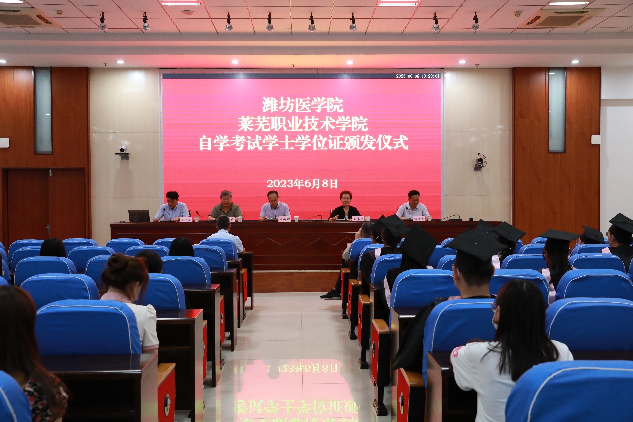 6月8日,学校与潍坊医学院联合举行自学考试本科学位证书颁发仪式。来自学校医学技术与护理系的39名学生,顺利完成潍坊医学院的自考本科学业。潍坊医学院虞河校区党委书记、继续教育学院院长李向辉,学校副院长邹翠兰出席证书颁发仪式,潍坊医学院继续教育学院、学校医学技术与护理系、职业能力训练中心相关负责人及15名毕业生代表参加颁发仪式。