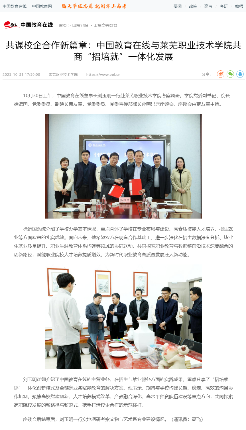 刘玉明详细介绍了中国教育在线的主营业务、在招生与就业服务方面的实践成果,重点分享了“招培就评”一体化创新模式及全链条业务赋能教育的解决方案。他表示,期待与学校构建长期、稳定、高效的沟通协作机制,聚焦高校党建创新、人才培养模式改革、产教融合深化、高水平师资队伍建设等重点方向,共同探索高职院校发展的新路径与新范式,携手打造校企合作的示范标杆。