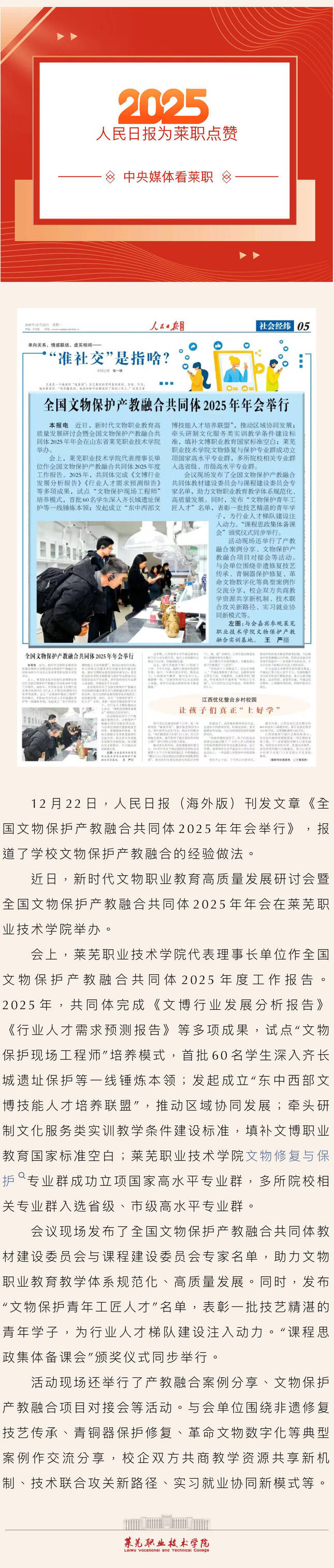 【济南广电】中央媒体看莱职丨人民日报点赞莱职文物保护产教融合经验做法!