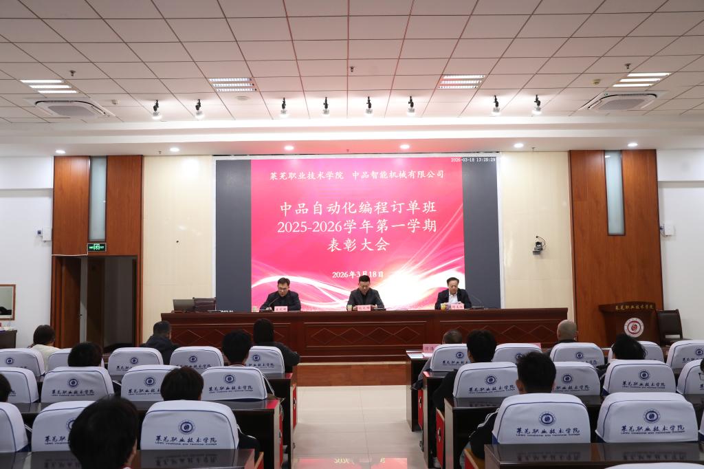 3月18日,学校举行中品自动化编程订单班2025-2026学年第一学期表彰大会。学校党委委员、副院长周美栋,中品智能机械有限公司副总经理殷天帅出席会议。