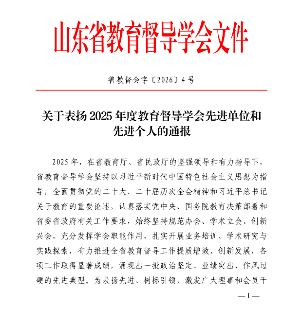 近日,山东省教育督导学会印发《关于表扬2025年度教育督导学会先进单位和先进个人的通报》,人妻Av无码系列一区二区三区荣获“山东省教育督导学会先进单位”称号。