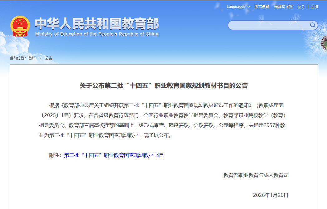 第二批“十四五”国家规划教材遴选工作由教育部统筹组织,严格遵循“价值引领、质量为先、守正创新、对接需求”的核心原则,经省级推荐、多轮专家评审、社会公示等严格程序确定,是我国教材建设领域的最高级别认定之一。